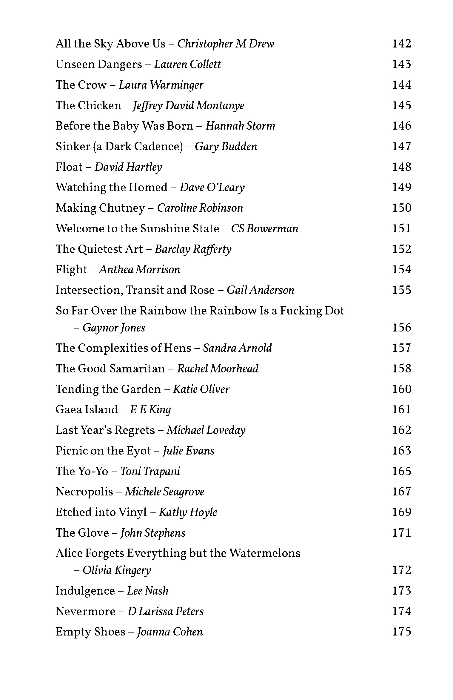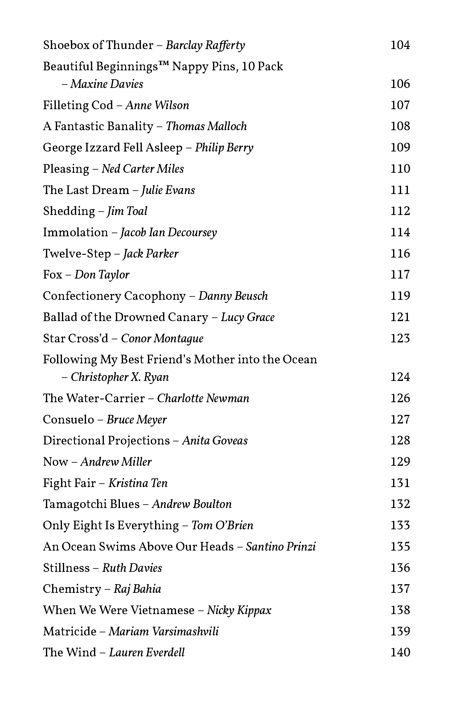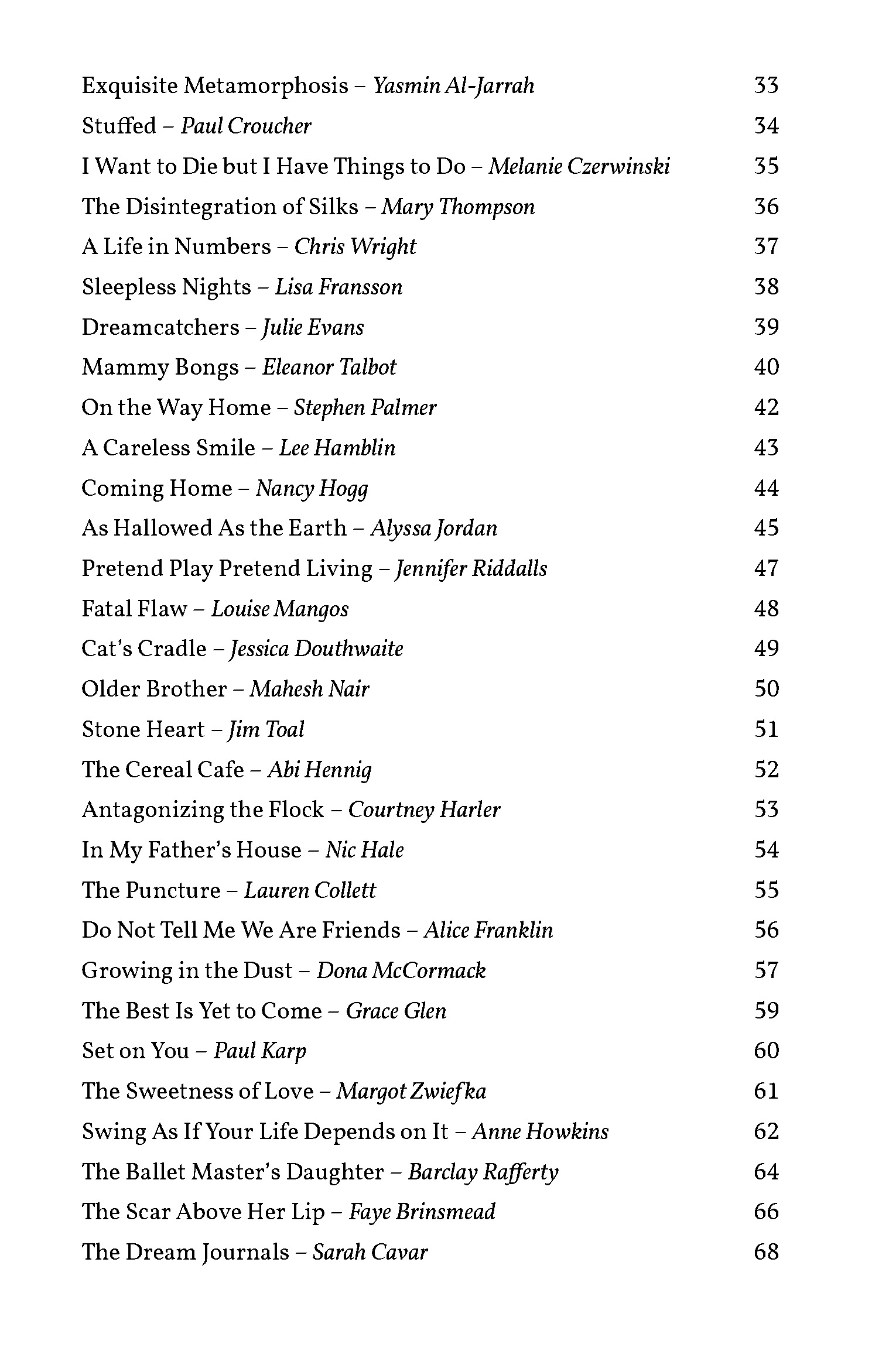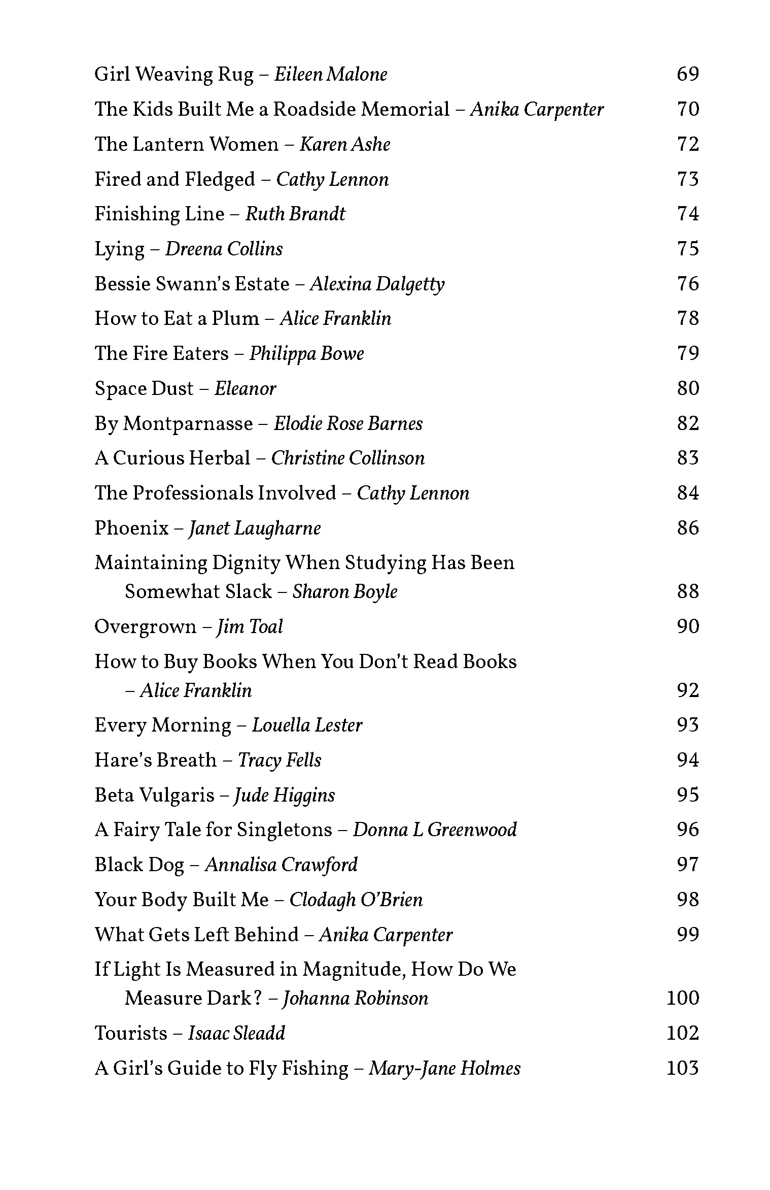 Includes prize-winning stories by: Mary-Jane Holmes, Gail Anderson, Sandra Arnold, Lauren Collett, Billy Cowan, Maxine Davies, Alice Franklin, Gaynor Jones, Dona McCormack, Izzy Paprika, Barclay Rafferty, and Andrew Stancek.