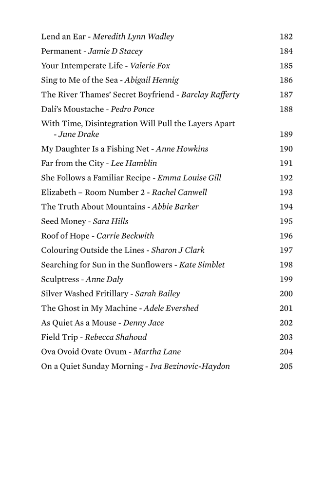 Includes prize-winning flash fiction from Annette Edwards-Hill, Jeanine Skowronski, Thomas Malloch, Joshua Jones, Kirsteen Ure, Simon Linter, Morgan Quinn, Matt Kendrick, Evelyn Forest, Becca Yenser, Karen Jones, Rosaleen Lynch, Nora Nadjarian, Jo Withers, and Katja Sass.