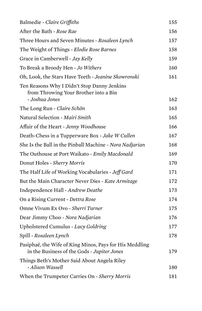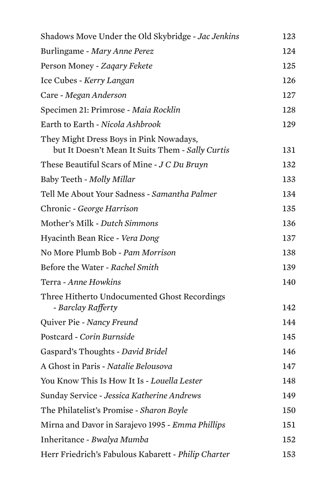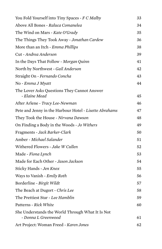 Within these pages, the traditional narrative shares space with the experimental. Humour sits alongside tragedy. Each of these page-long stories packs a punch greater than its word count suggests.
